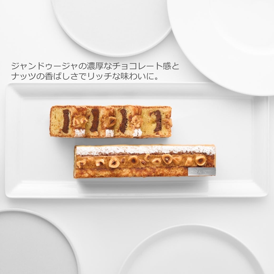 天面にはヘーゼルナッツのプラリネとローストナッツをあしらうことでコクや食感のアクセントにし、アン グランのミニャルディーズ作りで大切にしている食感・香り・余韻を閉じ込めています。